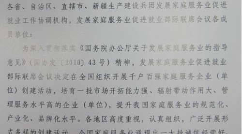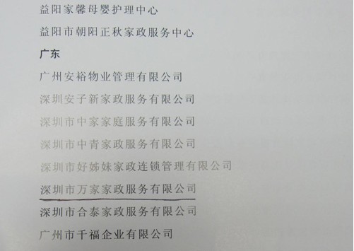 日前,万家家政网络部记者从广东省人力资源和时候保障厅获悉深圳市万家家政服务有限公司当选为全国千户百强家庭服务企业。